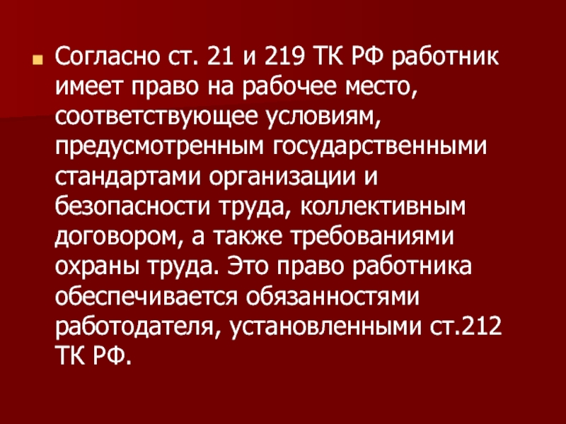 Слайд 8Согласно ст. 21 и 219 ТК РФ работник имеет право на