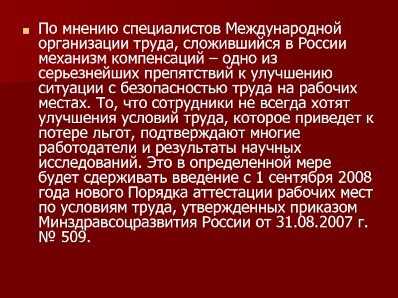 Слайд 24По мнению специалистов Международной организации труда, сложившийся в России механизм компенсаций
