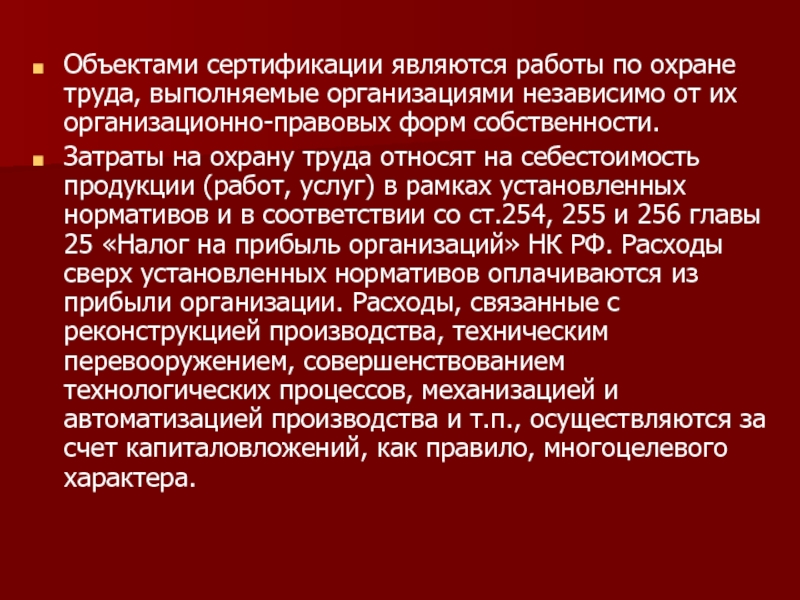 Слайд 28Объектами сертификации являются работы по охране труда, выполняемые организациями независимо от