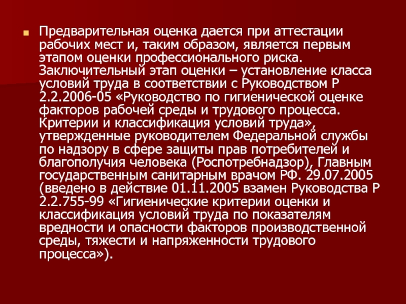 первым этапом оценки профессионального риска. Заключительный этап оценки – установление класса условий труда в соответствии с Руководством Р 2.2.2006-05 «Руководство по гигиенической оценке факторов рабочей среды и трудового процесса. Критерии и классификация условий труда», утвержденные руководителем Федеральной службы по надзору в сфере защиты прав потребителей и благополучия человека (Роспотребнадзор), Главным государственным санитарным врачом РФ. 29.07.2005 (введено в действие 01.11.2005 взамен Руководства Р 2.2.755-99 «Гигиенические критерии оценки и классификация условий труда по показателям вредности и опасности факторов производственной среды, тяжести и напряженности трудового процесса»).