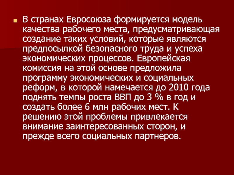 условий, которые являются предпосылкой безопасного труда и успеха экономических процессов. Европейская комиссия на этой основе предложила программу экономических и социальных реформ, в которой намечается до 2010 года поднять темпы роста ВВП до 3 % в год и создать более 6 млн рабочих мест. К решению этой проблемы привлекается внимание заинтересованных сторон, и прежде всего социальных партнеров.
