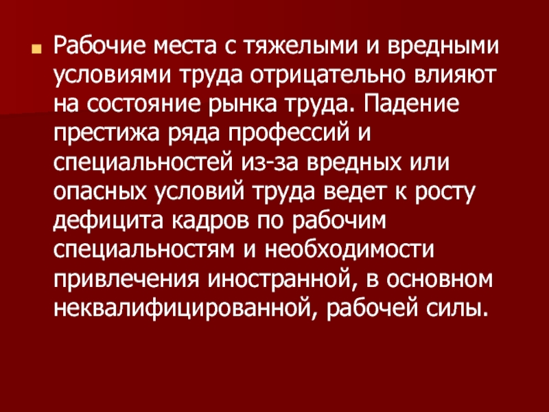 состояние рынка труда. Падение престижа ряда профессий и специальностей из-за вредных или опасных условий труда ведет к росту дефицита кадров по рабочим специальностям и необходимости привлечения иностранной, в основном неквалифицированной, рабочей силы.