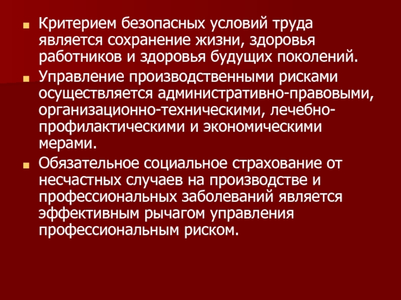 Слайд 22Критерием безопасных условий труда является сохранение жизни, здоровья работников и здоровья