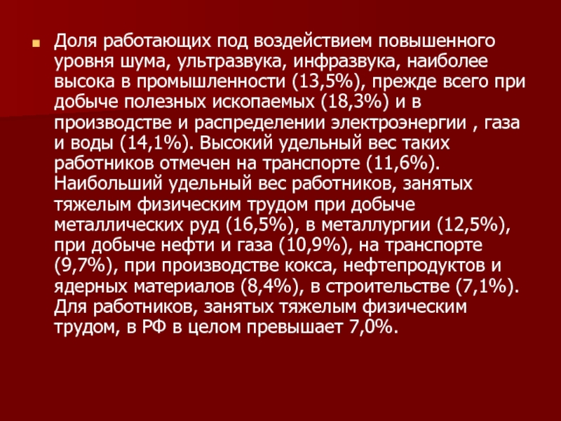 в промышленности (13,5%), прежде всего при добыче полезных ископаемых (18,3%) и в производстве и распределении электроэнергии , газа и воды (14,1%). Высокий удельный вес таких работников отмечен на транспорте (11,6%). Наибольший удельный вес работников, занятых тяжелым физическим трудом при добыче металлических руд (16,5%), в металлургии (12,5%), при добыче нефти и газа (10,9%), на транспорте (9,7%), при производстве кокса, нефтепродуктов и ядерных материалов (8,4%), в строительстве (7,1%). Для работников, занятых тяжелым физическим трудом, в РФ в целом превышает 7,0%.