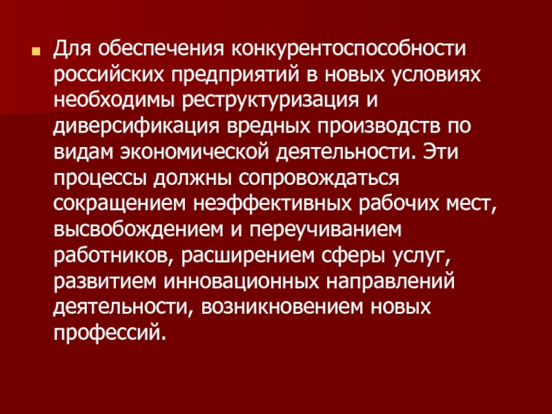диверсификация вредных производств по видам экономической деятельности. Эти процессы должны сопровождаться сокращением неэффективных рабочих мест, высвобождением и переучиванием работников, расширением сферы услуг, развитием инновационных направлений деятельности, возникновением новых профессий.