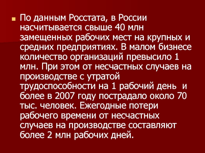мест на крупных и средних предприятиях. В малом бизнесе количество организаций превысило 1 млн. При этом от несчастных случаев на производстве с утратой трудоспособности на 1 рабочий день и более в 2007 году пострадало около 70 тыс. человек. Ежегодные потери рабочего времени от несчастных случаев на производстве составляют более 2 млн рабочих дней.