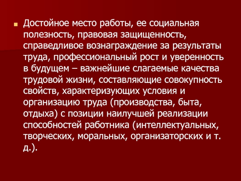 Слайд 4Достойное место работы, ее социальная полезность, правовая защищенность, справедливое вознаграждение за