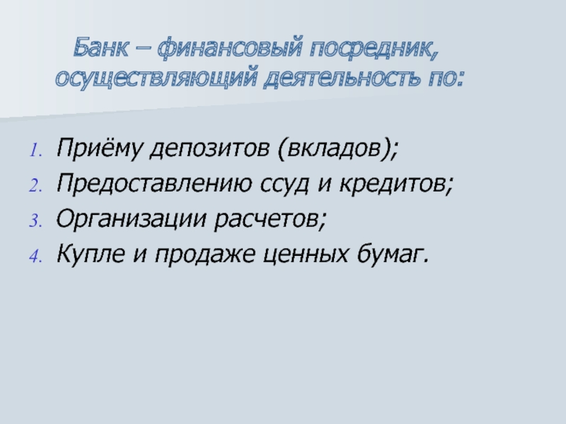 Слайд 2 Банк – финансовый посредник, осуществляющий деятельность по: