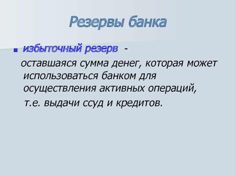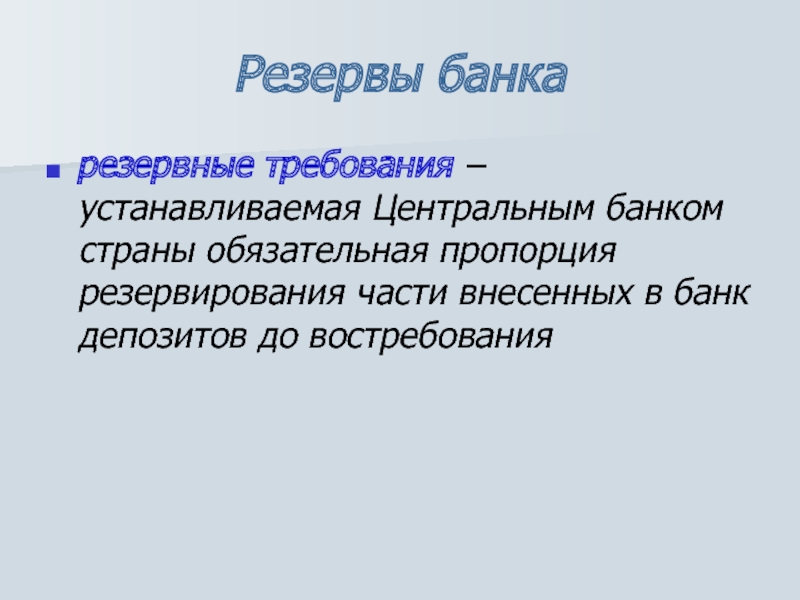 резервные требования – устанавливаемая Центральным банком страны обязательная пропорция резервирования