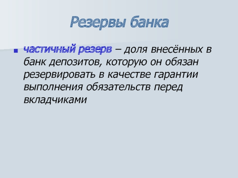 частичный резерв – доля внесённых в банк депозитов, которую он