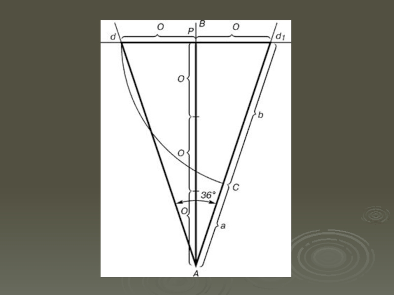 отрезок О произвольной величины, через полученную точку Р проводим перпендикуляр к линии АВ, на перпендикуляре вправо и влево от точки Р откладываем отрезки О. Полученные точки d и d1 соединяем прямыми с точкой А. Отрезок dd1 откладываем на линию Ad1, получая точку С. Она разделила линию Ad1 в пропорции золотого сечения.