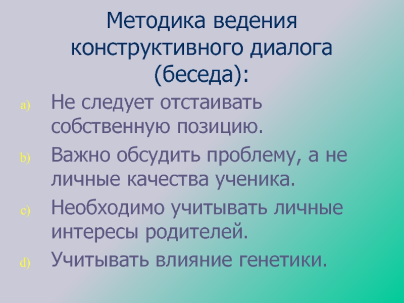 Слайд 10Методика ведения конструктивного диалога (беседа):