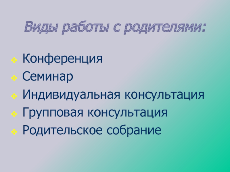 Слайд 2Виды работы с родителями: