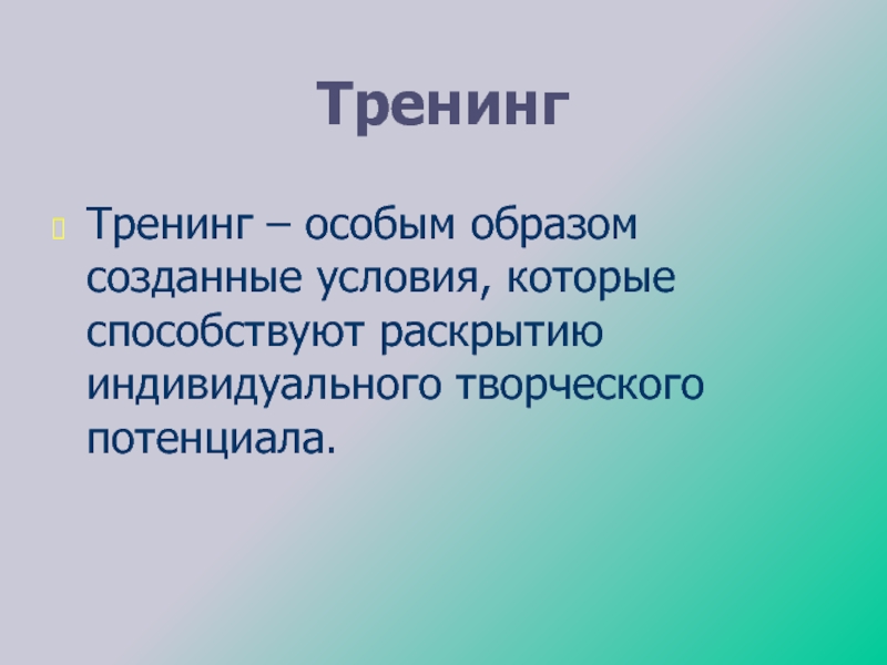 Тренинг – особым образом созданные условия, которые способствуют раскрытию индивидуального творческого
