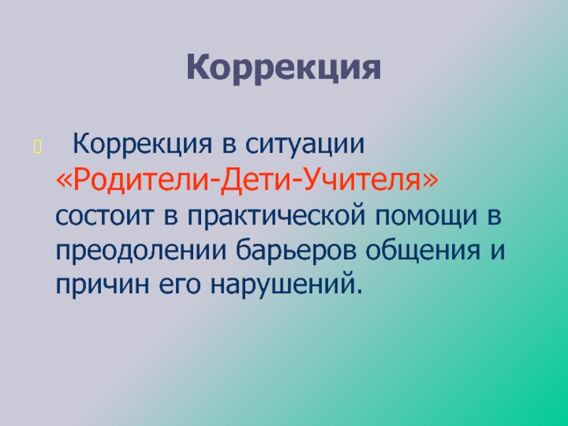 Коррекция в ситуации «Родители-Дети-Учителя» состоит в практической помощи в