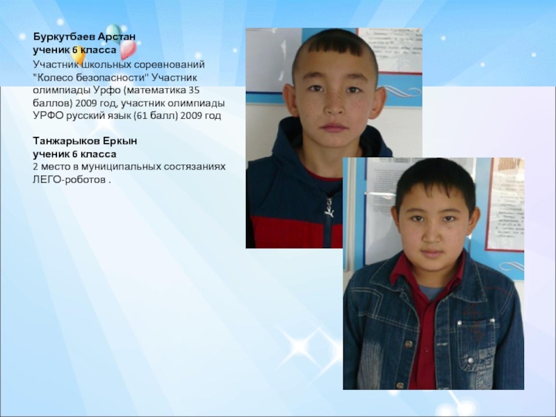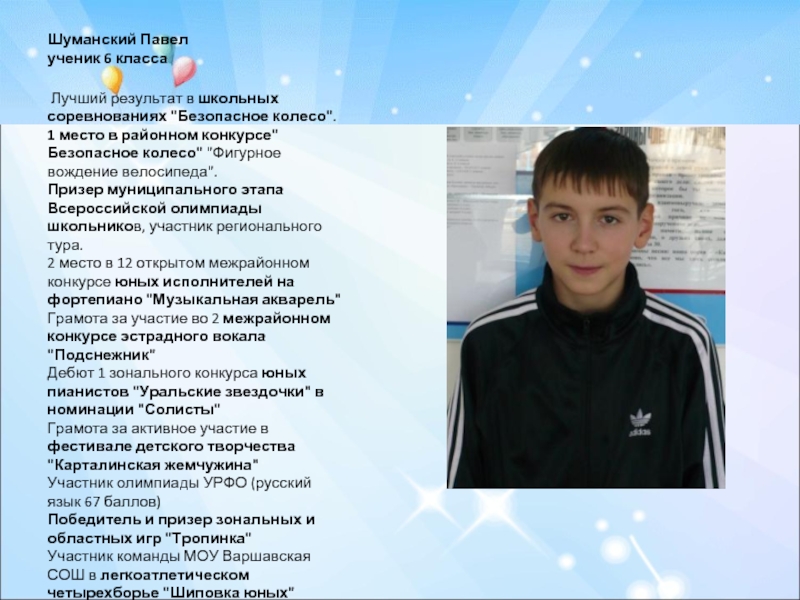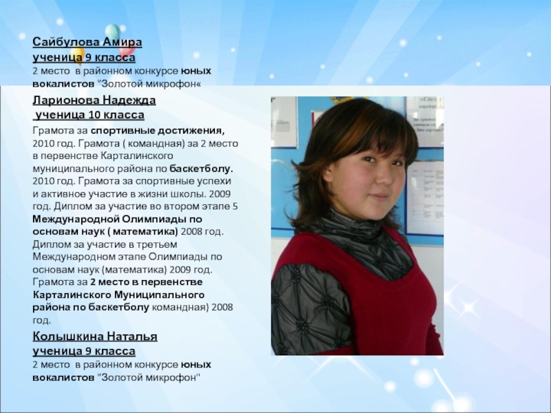 Грамота  в спортивном командном конкурсе «Олимпийский резерв». 2010 год. Грамота за 3 место в Спартакиаде учащихся Карталинского района по шахматам. 2010 год. Грамота за 2 место в номинации « Исследовательская работа» в районной конференции « Исследователи 21 в». 2010 год. Грамота за спортивные и творческие достижения. 2010 год. Диплом за первое место в районной выставке детского творчества