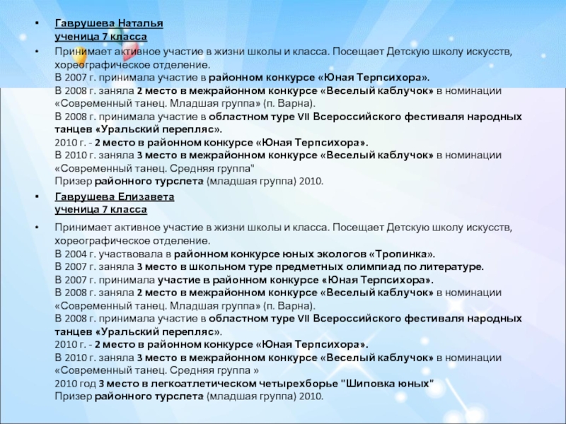 В 2007 г. принимала участие в районном конкурсе «Юная Терпсихора».