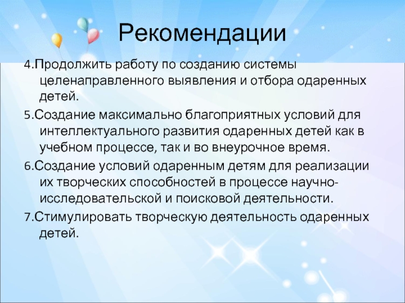 4.Продолжить работу по созданию системы целенаправленного выявления и отбора одаренных детей.