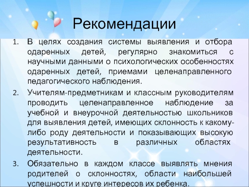 В целях создания системы выявления и отбора одаренных детей, регулярно знакомиться