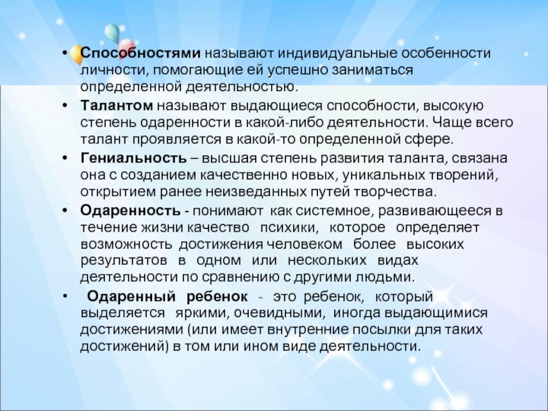 Слайд 2Способностями называют индивидуальные особенности личности, помогающие ей успешно заниматься определенной деятельностью.