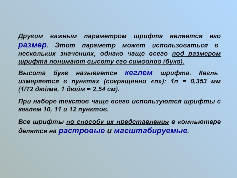Слайд 7Другим важным параметром шрифта является его размер. Этот параметр может использоваться