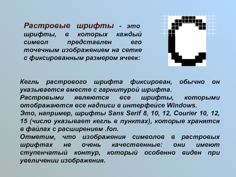 Отметим, что изображения символов в растровых шрифтах не очень качественные: они имеют ступенчатый контур, который особенно виден при увеличении изображения.