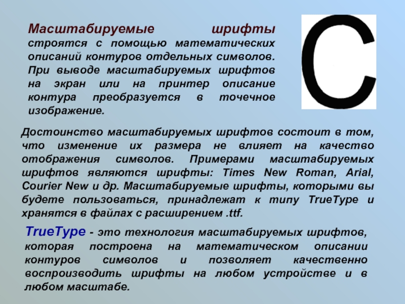 Слайд 9Масштабируемые шрифты строятся с помощью математических описаний контуров отдельных символов. При