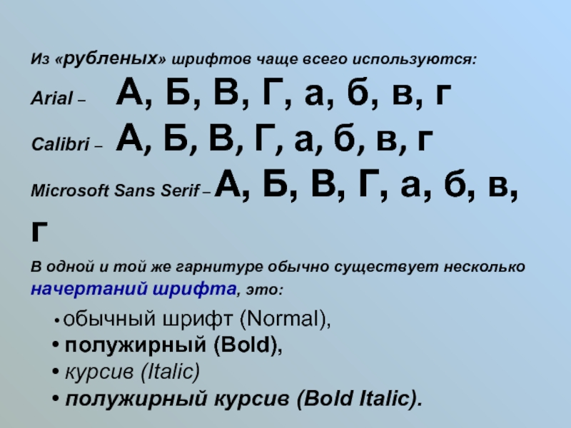 Слайд 6Из «рубленых» шрифтов чаще всего используются: