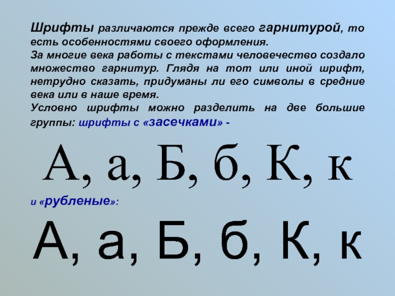 Слайд 4Шрифты различаются прежде всего гарнитурой, то есть особенностями своего оформления.