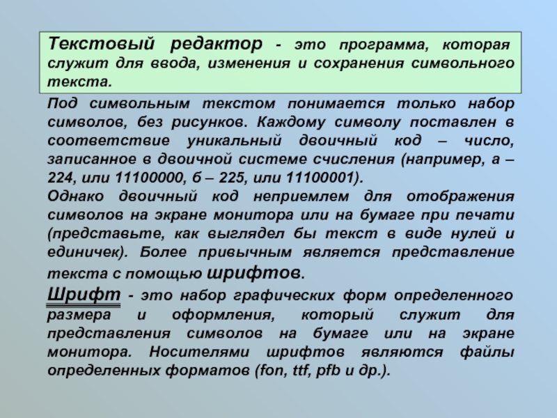 Под символьным текстом понимается только набор символов, без рисунков. Каждому символу поставлен в соответствие уникальный двоичный код – число, записанное в двоичной системе счисления (например, а – 224, или 11100000, б – 225, или 11100001).