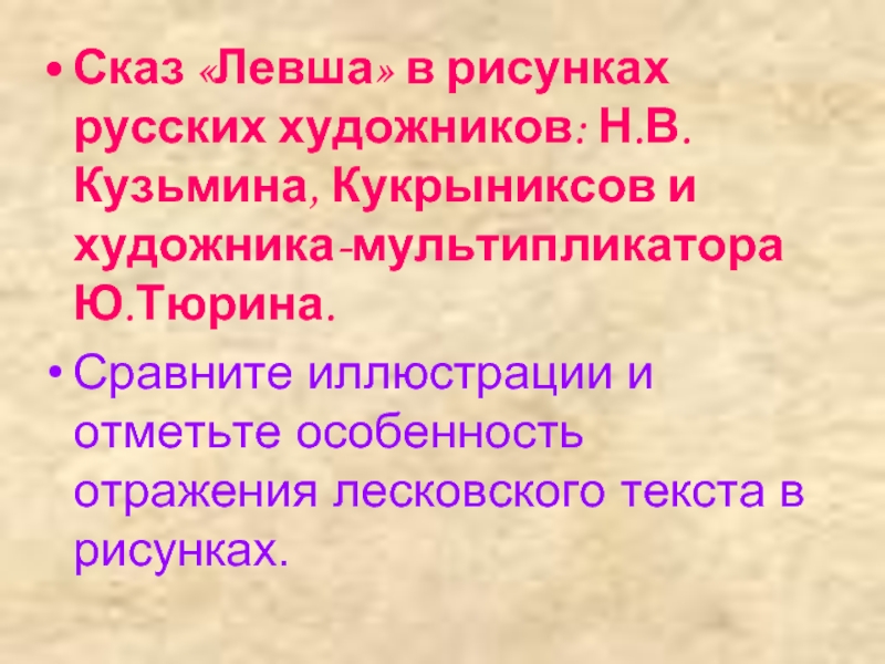 Слайд 16Сказ «Левша» в рисунках русских художников: Н.В.Кузьмина, Кукрыниксов и художника-мультипликатора Ю.Тюрина.