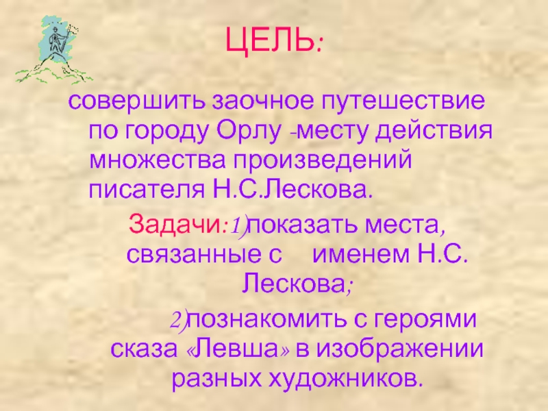 Задачи:1)показать места, связанные с именем Н.С.Лескова;