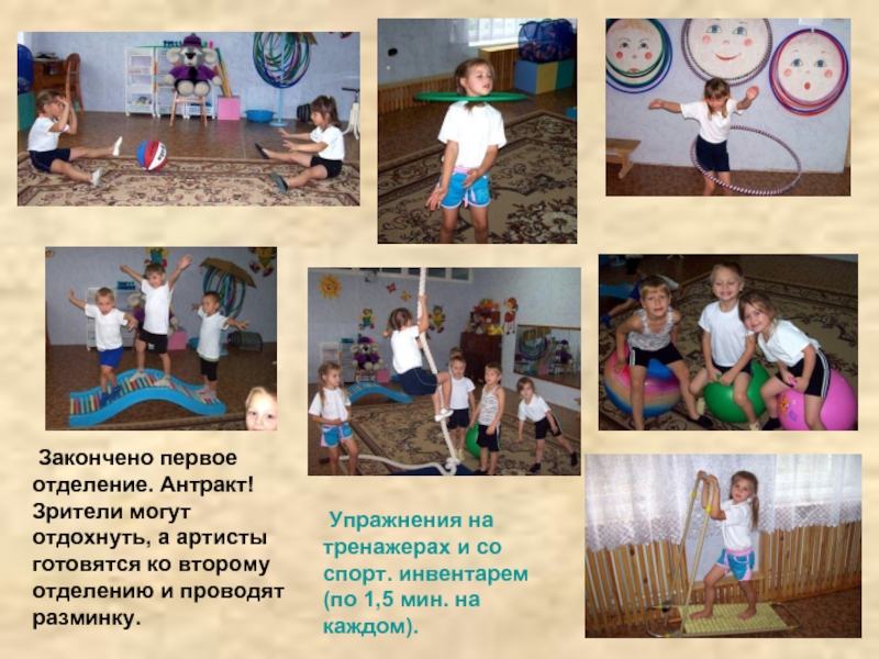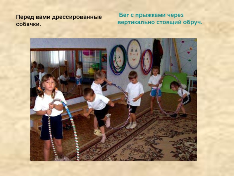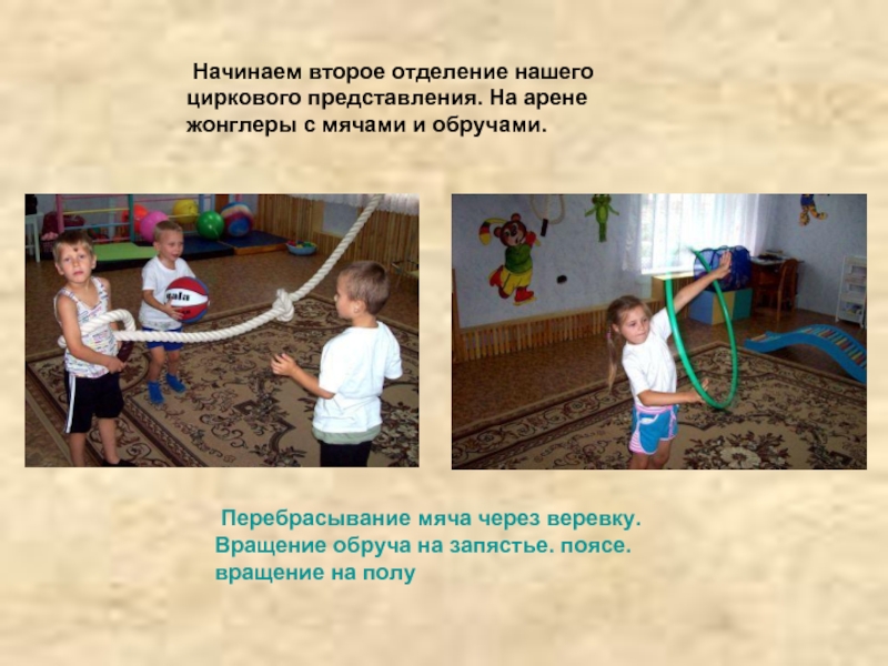 Перебрасывание мяча через веревку. Вращение обруча на запястье. поясе. вращение на полу
