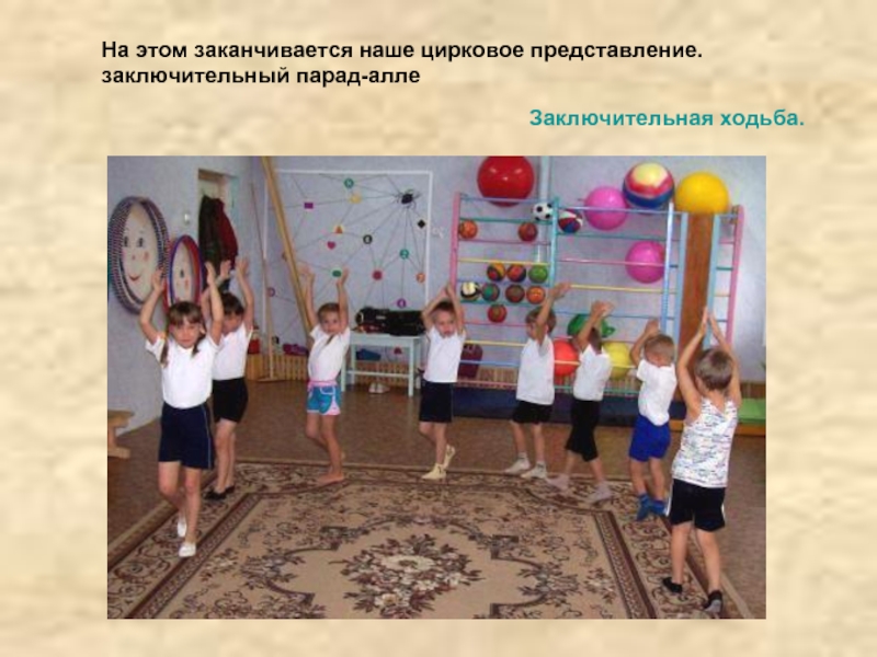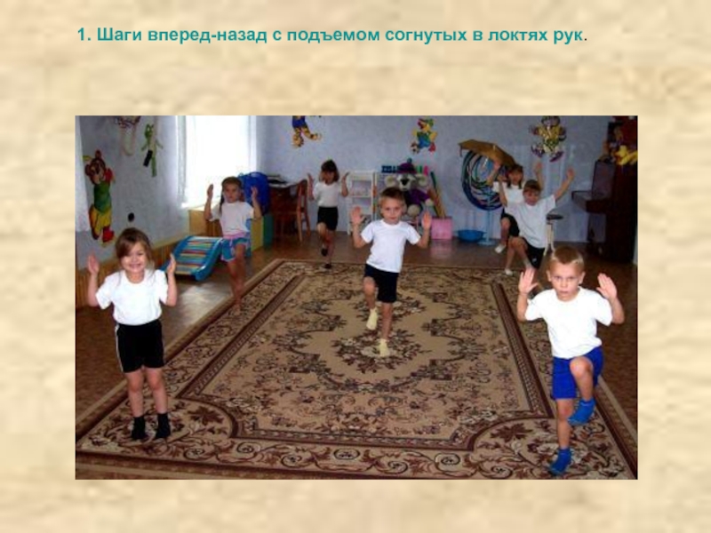 Ходьба обычная по кругу, с поднятыми вверх руками, с хлопками над головой.