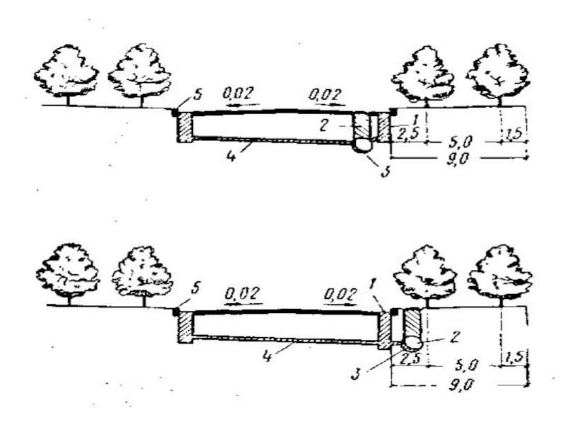 Слайд 33Схема закрытого водоотвода на дорогах с усовершенствованными покрытиями 1—дождеприемный колодец; 2
