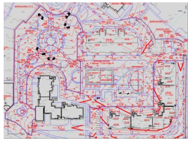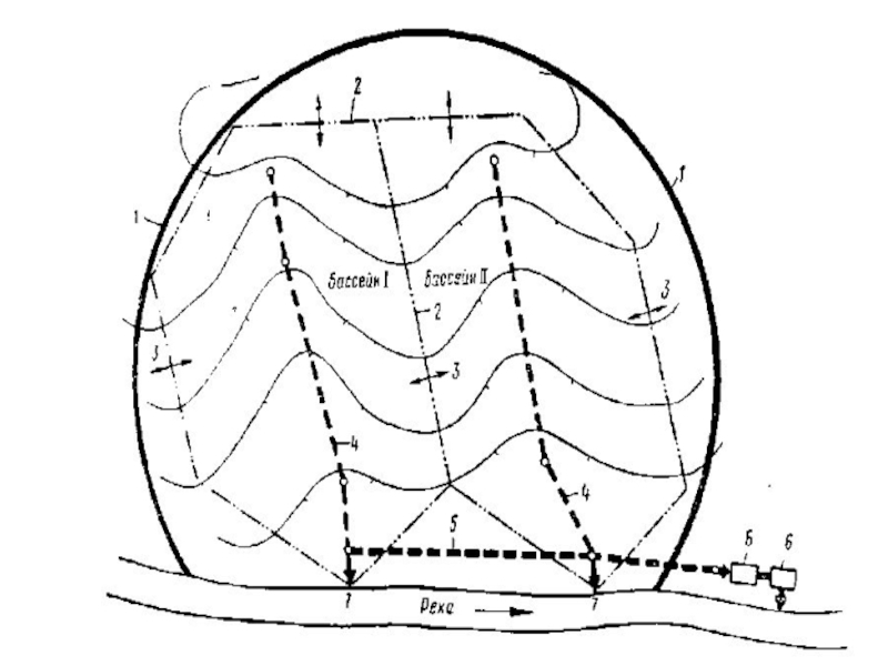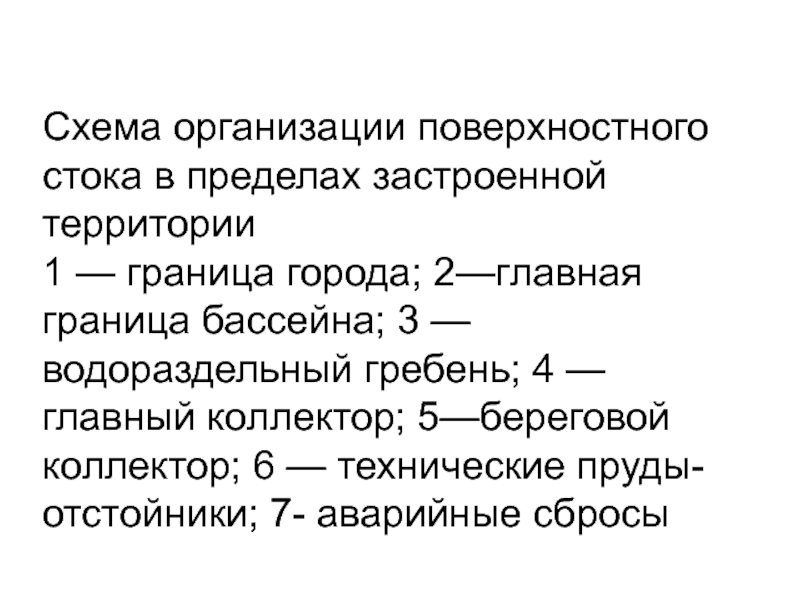 2—главная граница бассейна; 3 — водораздельный гребень; 4 — главный коллектор; 5—береговой коллектор; 6 — технические пруды-отстойники; 7- аварийные сбросы