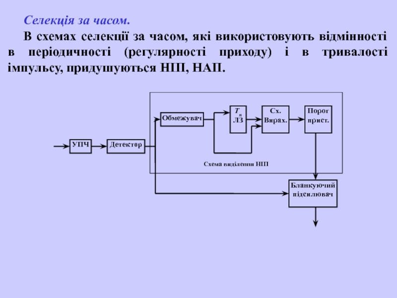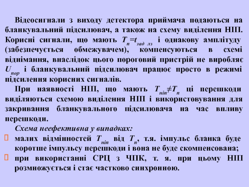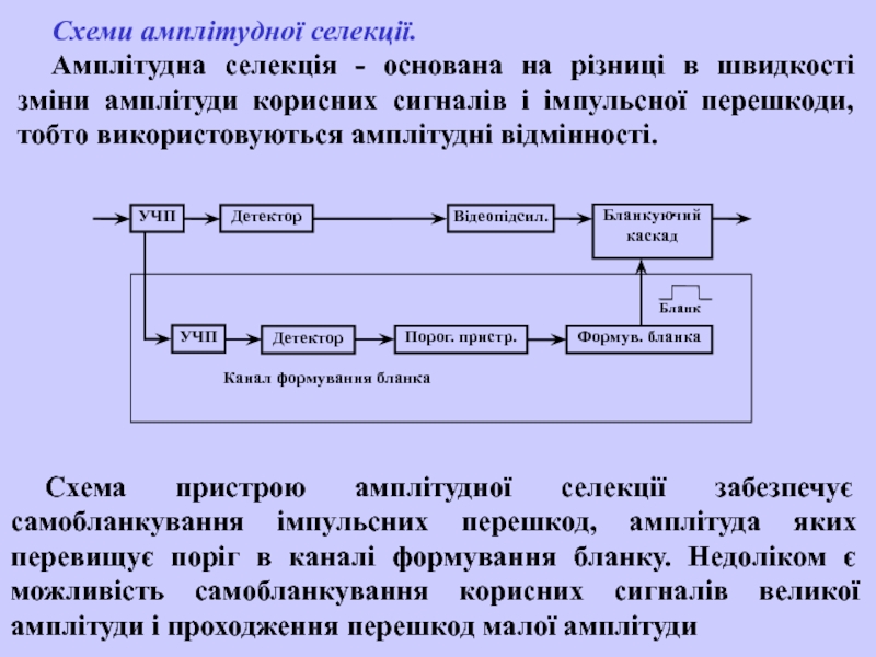 Схема пристрою амплітудної селекції забезпечує самобланкування імпульсних перешкод, амплітуда яких перевищує поріг в каналі формування бланку. Недоліком є можливість самобланкування корисних сигналів великої амплітуди і проходження перешкод малої амплітуди
