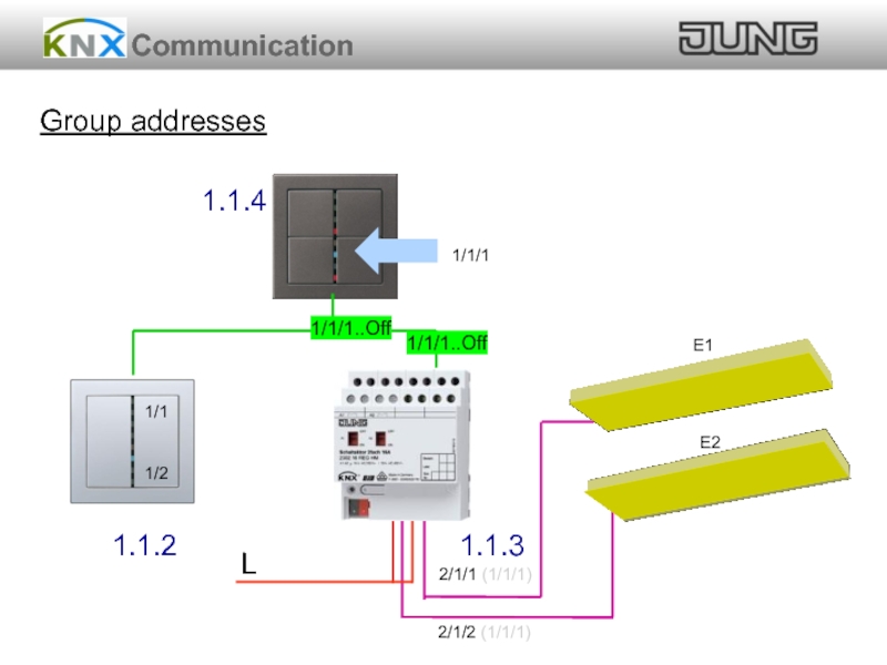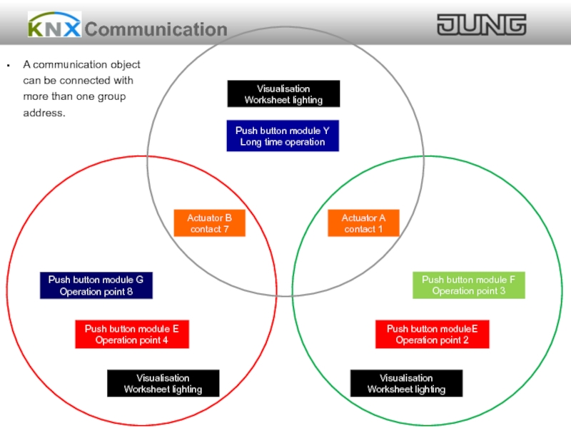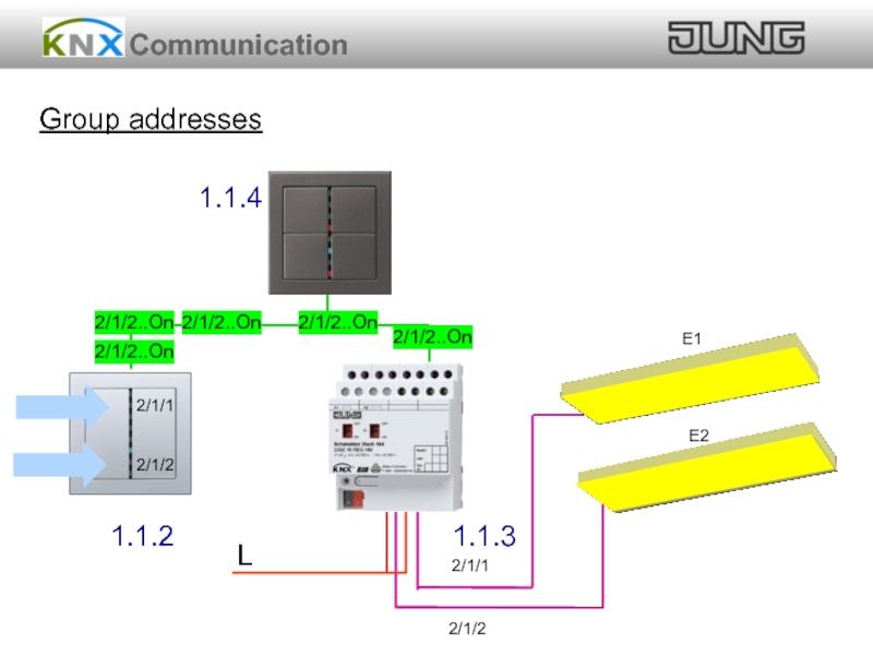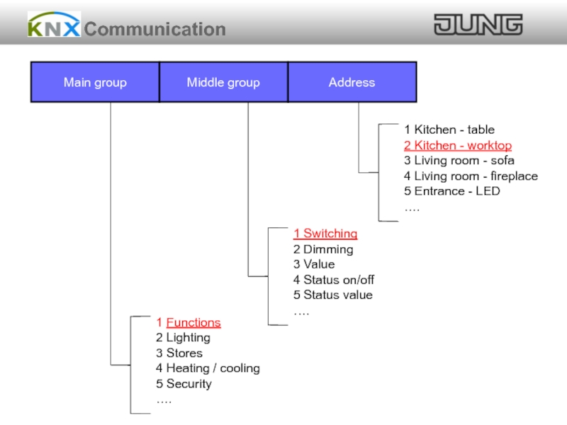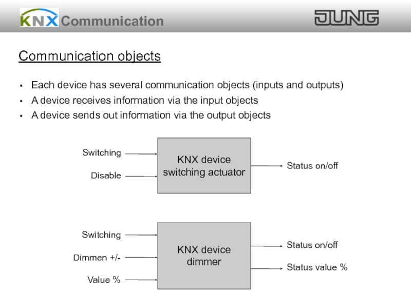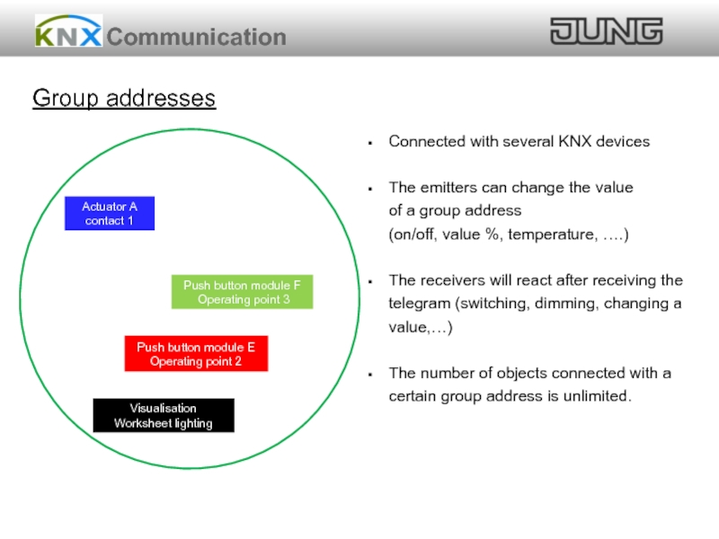 The receivers will react after receiving the telegram (switching, dimming, changing a value,…)