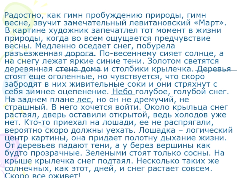 звучит замечательный левитановский «Март». В картине художник запечатлел тот момент в жизни природы, когда во всем ощущается предчувствие весны. Медленно оседает снег, побурела разъезженная дорога. По-весеннему сияет солнце, а на снегу лежат яркие синие тени. Золотом светятся деревянная стена дома и столбики крылечка. Деревья стоят еще оголенные, но чувствуется, что скоро забродят в них живительные соки и они стряхнут с себя зимнее оцепенение. Небо голубое, голубой снег. На заднем плане лес, но он не дремучий, не страшный. В него хочется войти. Около крыльца снег растаял, дверь оставили открытой, ведь холодов уже нет. Кто-то приехал на лошади, ее не распрягали, вероятно скоро должны уехать. Лошадка – логический центр картины, она придает полотну дыхание жизни. От деревьев падают тени, а у берез вершины как будто прозрачные. Зелеными стоят только сосны. На крыше крылечка снег подтаял. Несколько таких же солнечных, как этот, дней, и снег растает совсем. Скоро все оживет!