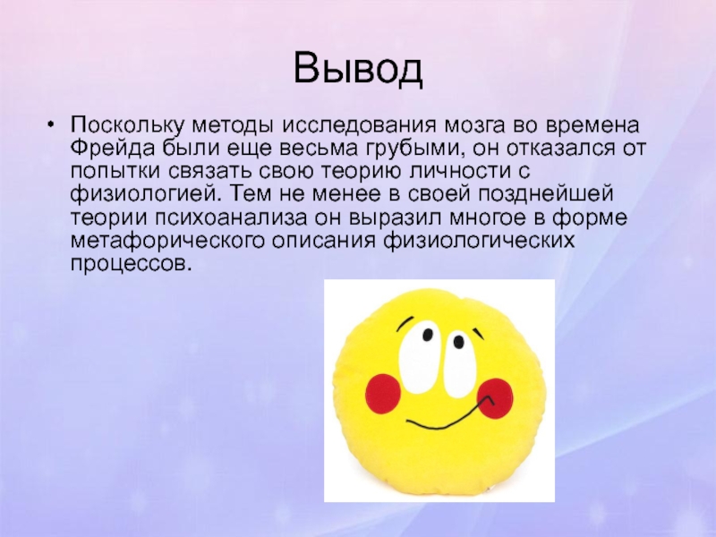 он отказался от попытки связать свою теорию личности с физиологией. Тем не менее в своей позднейшей теории психоанализа он выразил многое в форме метафорического описания физиологических процессов.