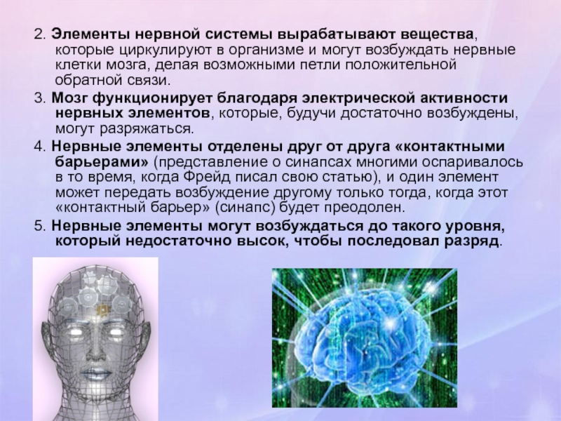 4. Нервные элементы отделены друг от друга «контактными барьерами» (представление о синапсах многими оспаривалось в то время, когда Фрейд писал свою статью), и один элемент может передать возбуждение другому только тогда, когда этот «контактный барьер» (синапс) будет преодолен.