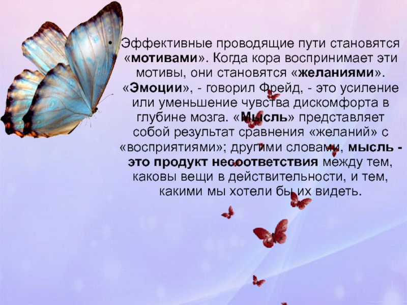 становятся «желаниями». «Эмоции», - говорил Фрейд, - это усиление или уменьшение чувства дискомфорта в глубине мозга. «Мысль» представляет собой результат сравнения «желаний» с «восприятиями»; другими словами, мысль - это продукт несоответствия между тем, каковы вещи в действительности, и тем, какими мы хотели бы их видеть.
