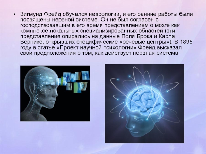 системе. Он не был согласен с господствовавшим в его время представлением о мозге как комплексе локальных специализированных областей (эти представления опирались на данные Поля Брока и Карла Вернике, открывших специфические «речевые центры»). В 1895 году в статье «Проект научной психологии» Фрейд высказал свои предположения о том, как действует нервная система.