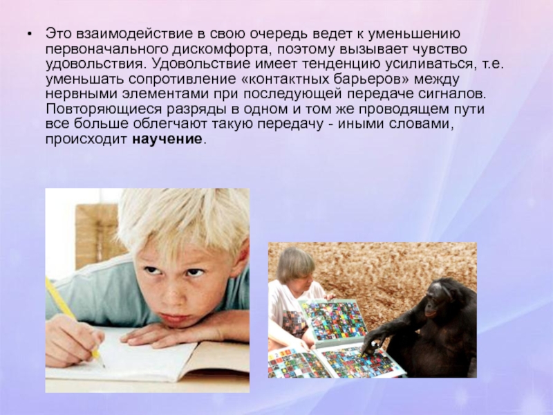 вызывает чувство удовольствия. Удовольствие имеет тенденцию усиливаться, т.е. уменьшать сопротивление «контактных барьеров» между нервными элементами при последующей передаче сигналов. Повторяющиеся разряды в одном и том же проводящем пути все больше облегчают такую передачу - иными словами, происходит научение.