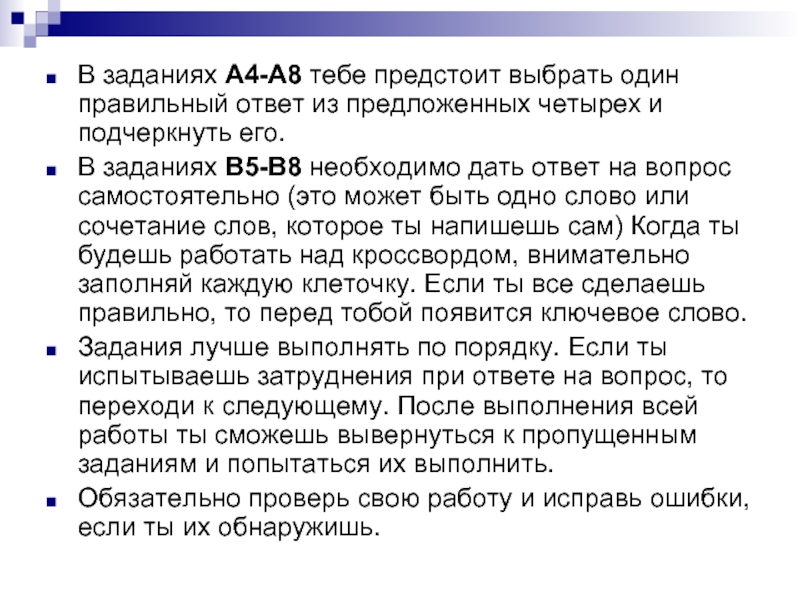 В заданиях В5-В8 необходимо дать ответ на вопрос самостоятельно (это может быть одно слово или сочетание слов, которое ты напишешь сам) Когда ты будешь работать над кроссвордом, внимательно заполняй каждую клеточку. Если ты все сделаешь правильно, то перед тобой появится ключевое слово.