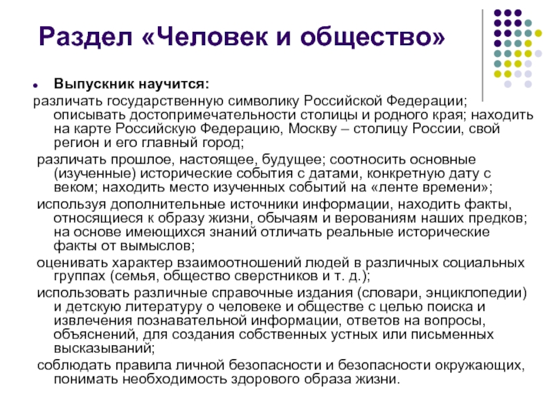 Общество. Человек – член общества. Россия – наша Родина. Государственная символика России. Государственные праздники. Россия на карте. Конституция – основной закон Российской Федерации. Права ребенка. Важнейшие события, происходящие в современной России.