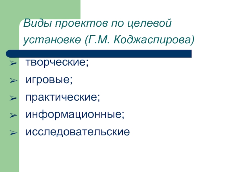 Слайд 23Виды проектов по целевой установке (Г.М. Коджаспирова)