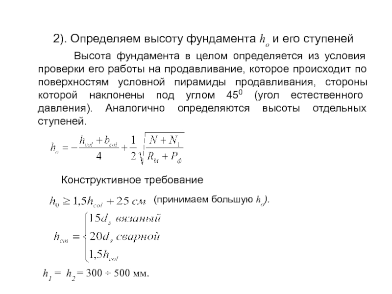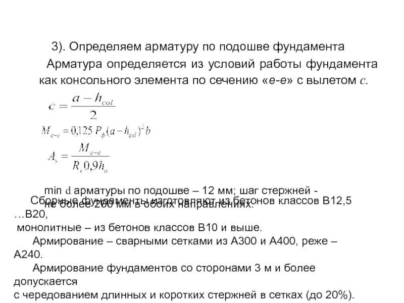 min d арматуры по подошве – 12 мм; шаг стержней -