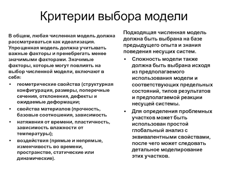 Подходящая численная модель должна быть выбрана на базе предыдущего опыта и знания поведения несущих систем.