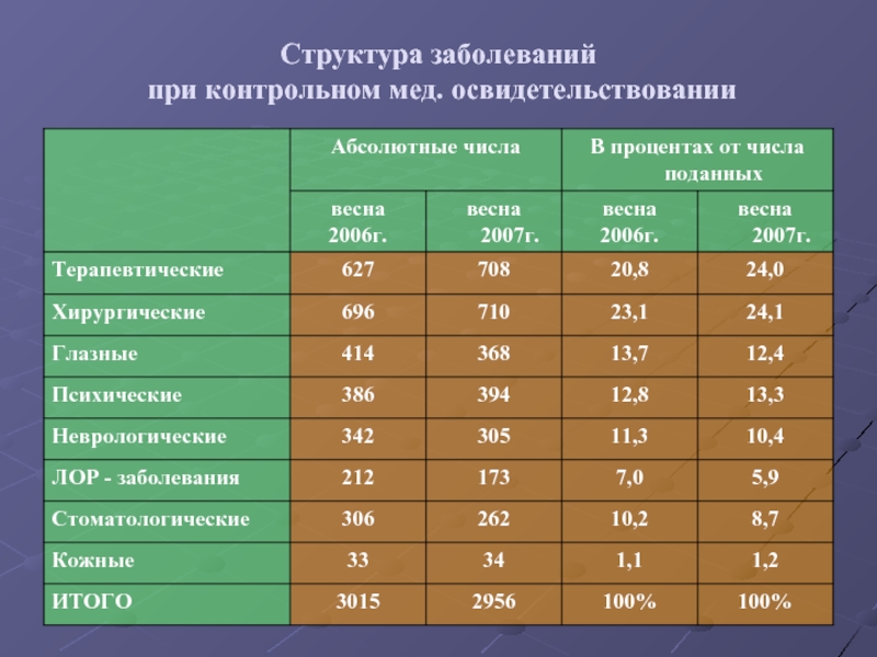 Слайд 11Структура заболеваний при контрольном мед. освидетельствовании